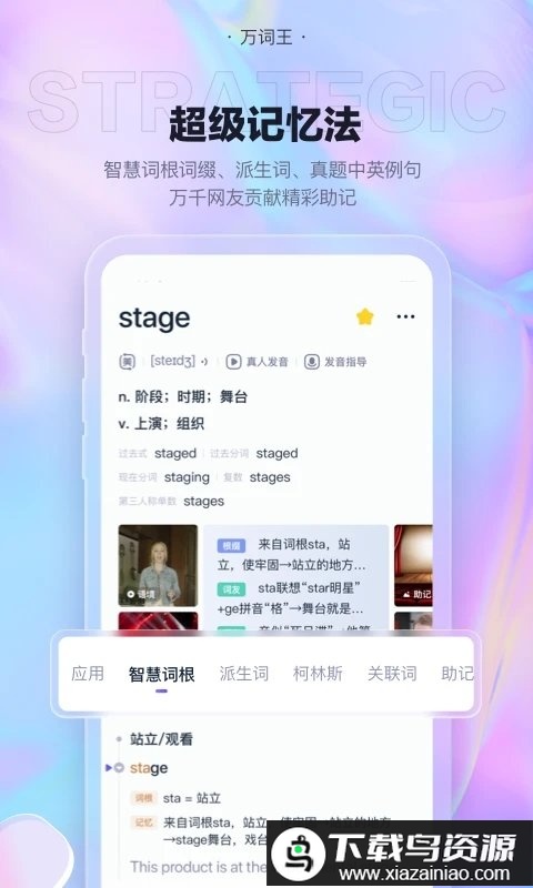 收录正版柯林斯英汉双解词典,融合词根词缀、词源故事、图片、谐音等多种记忆辅助内容。