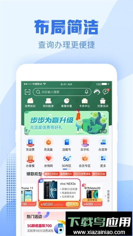 可轻松办理4G套餐、流量加油包、积分兑换等业务,帮助用户精打细算,畅享移动服务;