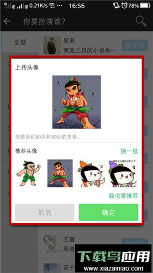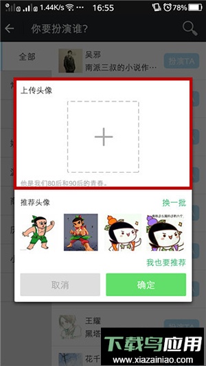1、选定扮演角色后,系统会弹出窗口让你选择初始头像;你可以使用推荐图片,也可以从相册中自主上传。如下图所示: