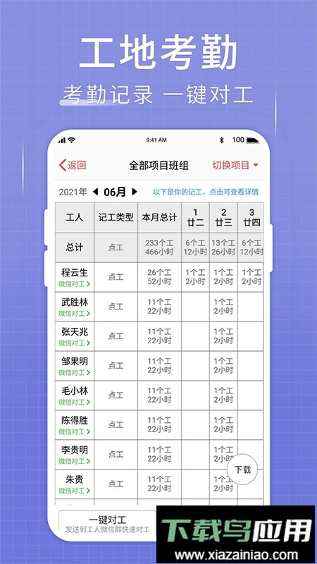 工地便捷记工:支持记工天、工时、加班,点工包工均适用;