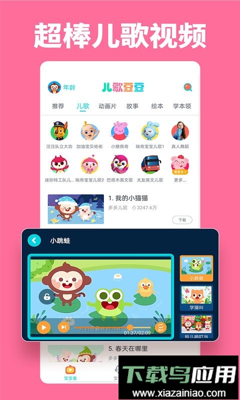 儿歌豆豆app拥有大量优质的儿歌与动画内容,打造了一个专属于孩子的早期教育乐园。这里汇集了众多热门动画、中英文经典儿歌以及生动的绘本故事等资源,旨在让孩子的学习过程充满乐趣,同时也为家长提供了便捷省心的育儿助手。