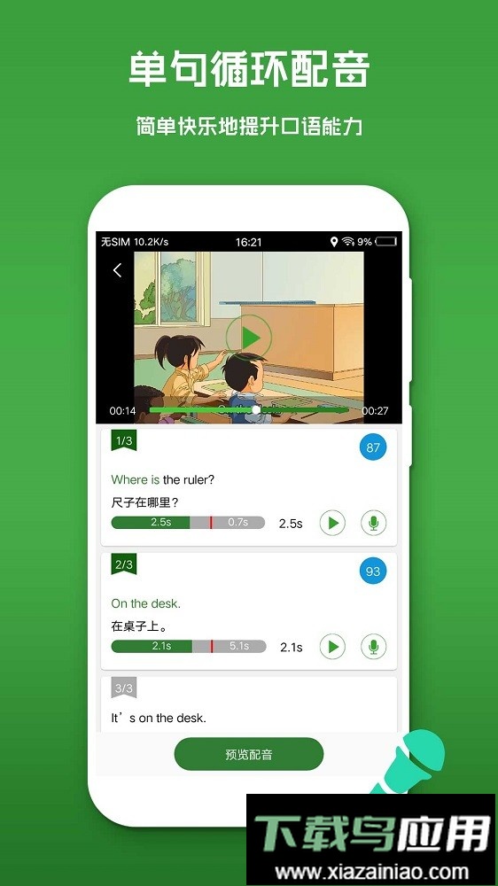 配音练习能逐步提升你的英语学习效果;随时随地进行视频配音,借助配音强化口语能力;加入自己的声音,体验配音工作的乐趣;每日持续更新视频素材库;无需背诵单词与语法,感受有趣味的学习过程。