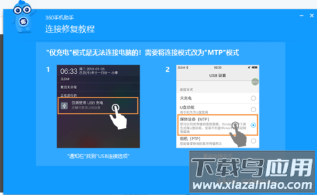 3、软件将显示连接修复指引,若手机仅设置为充电模式,需将USB连接模式切换为“MTP”传输模式方可正常连接。