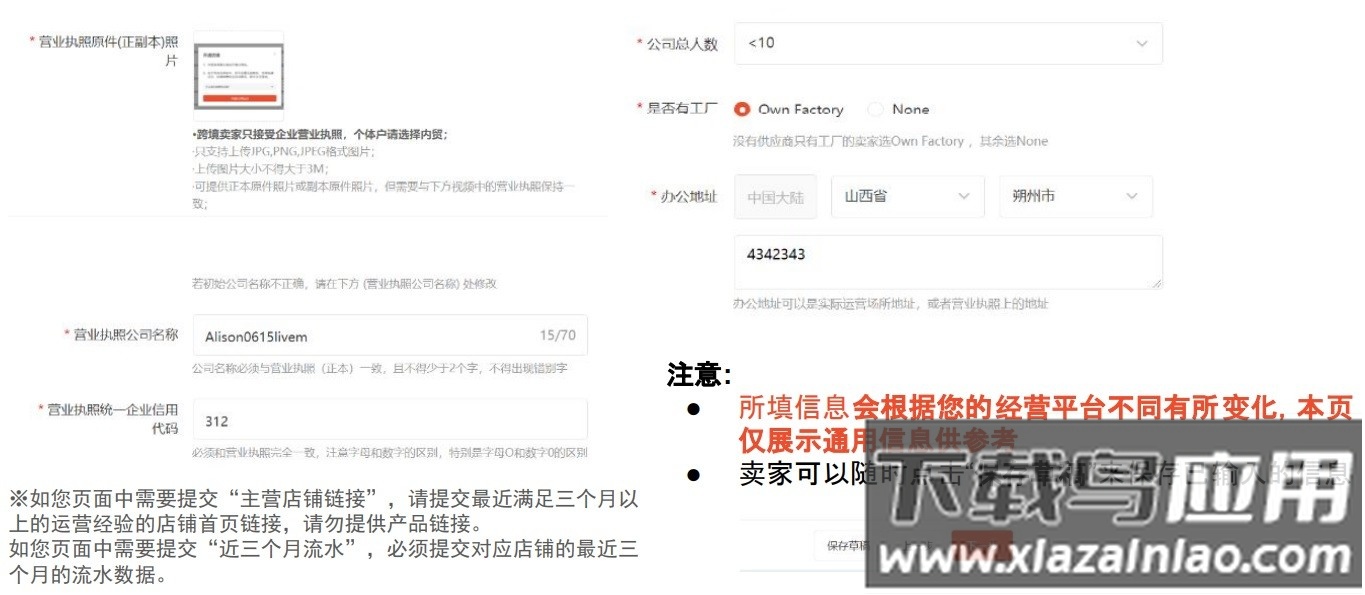 3. 公司信息:需填写营业执照原件或副本照片、公司全称、统一社会信用代码、员工人数、是否自有工厂、办公地址及邮编;请如实填写,并确保营业执照照片清晰完整,边框无遮挡。