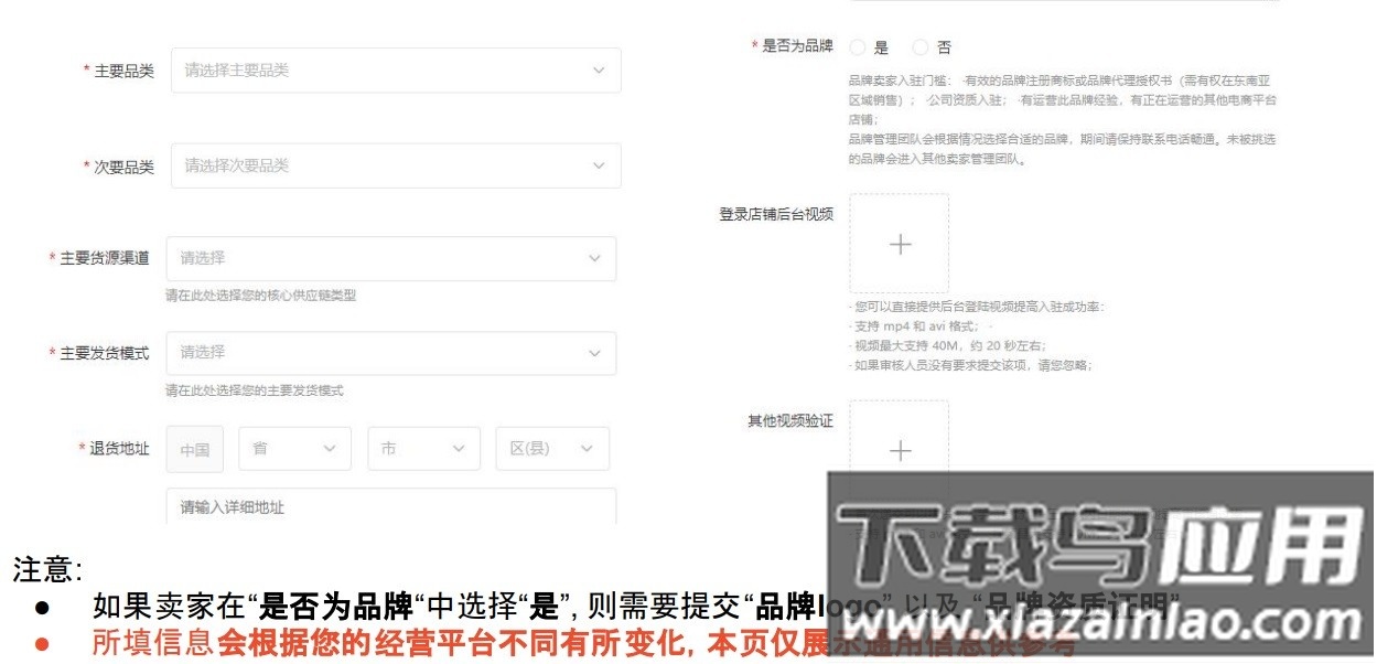4. 店铺信息:包括主营品类、辅营品类、主要货源渠道、主要发货模式、退货地址及是否品牌;平台对品牌资质审核较为严格,若非品牌方建议不要勾选,以免延缓审核进度。
