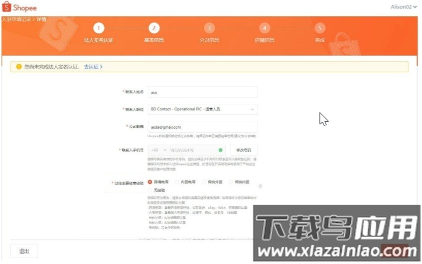 2. 联系人信息:包括姓名、职位、邮箱、手机号及过往运营经验;联系人信息不必与法人一致,可填写实际运营人员信息;过往运营经验的选择非常关键,它将影响首站可选站点及是否需要提供流水证明。