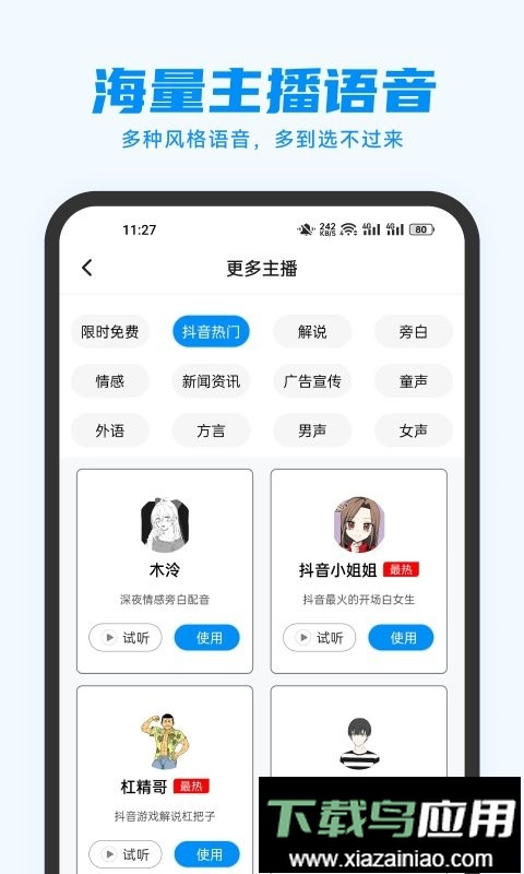 平台提供覆盖广泛的配音资源板块,用户可依据不同创作需求在线筛选并试用;