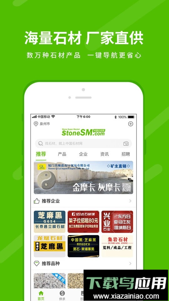 中国石材网stonesm.comAPP是专为石材行业设计的移动客户端应用,由泉州资鼎信息技术服务有限公司研发并运营。该公司旗下还拥有运营已逾十年的石材门户网站www.StoneSM.com与www.中国石材网.com。