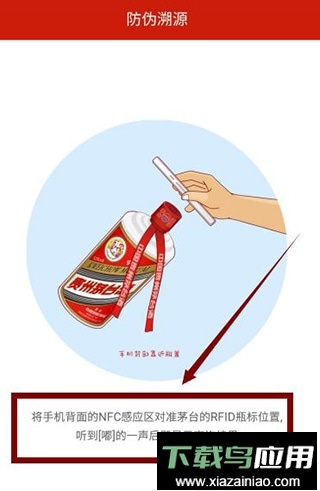打开客户端主界面,把手机背部的RFID感应区对准茅台酒瓶盖顶部区域,即可启动查询。