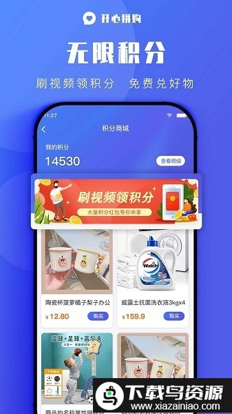 开心拼购app是一个汇聚海量优质商品的购物平台,这里网罗了来自各大商家的精选好物,品类齐全且质量可靠,平台承诺提供七天无忧退款服务,保障您的购物权益;您还可以通过浏览视频内容轻松赚取积分,享受边看边赚的乐趣,喜欢的就在本站下载。