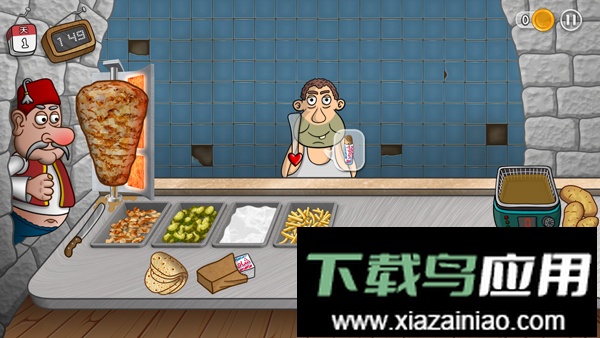 3、游戏初期操作:开始游戏后点击画面左侧的大叔角色,可获取另外两种材料;需要成功制作出一个完整卷饼后,才会有顾客上门。