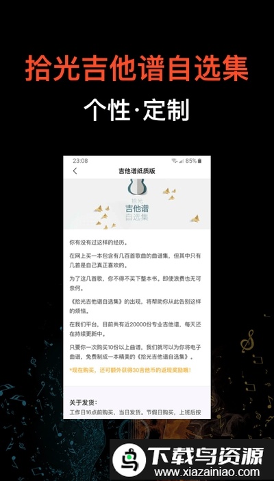 1、丰富的优质吉他谱与系统化自学教程;平台上的每份曲谱都经过重新编配,精选当下流行热门的弹唱谱例,并持续更新曲库;同时由经验丰富的教师编写了科学系统的自学课程,能有效帮助你提升弹奏水平。