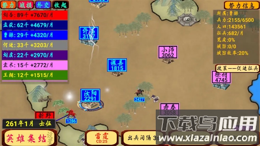 4、需要时刻留意城池下方显示的兵力数值,合理调配。