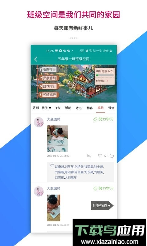 支持类似朋友圈的分享功能,学生可发表心情、见闻、习作、绘画与照片,便于相互学习与鼓励;家长可交流教育心得、展示孩子作品;教师可共享信息并进行学科研讨。