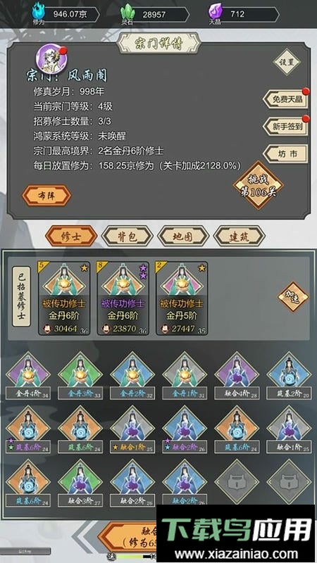 2、地图建筑可自由摆放规划,通过合理布局各类功能性建筑,能在优化收益的同时构筑美观的宗门景观;