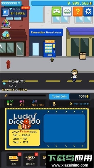 1、游戏界面设计简洁,手机屏幕下方集中了彩票、工作、社交、商店及背包等常用功能入口。