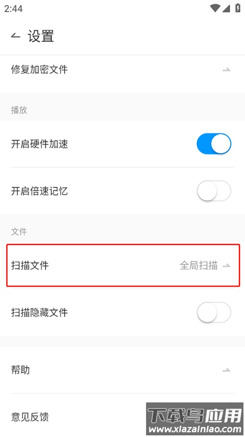 2、在设置菜单中找到并进入“扫描文件”选项;