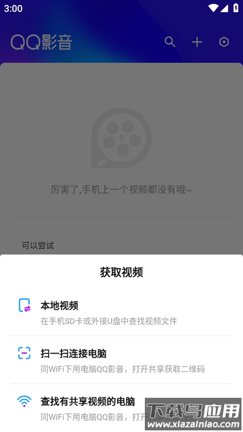 3、页面会显示三种视频获取方式:扫描本地视频、扫码连接电脑、查找共享视频的电脑,按需选择即可。