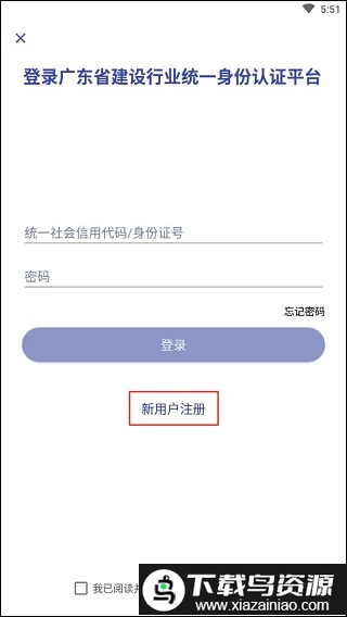 安装应用后打开粤建通,点击首页的【新用户注册】,按指引填写信息完成注册。
