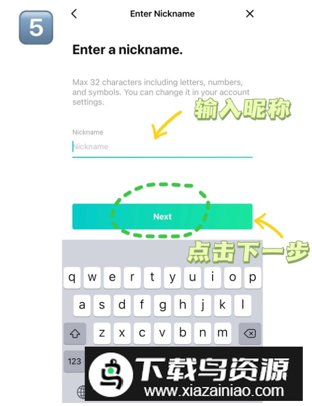 5.输入一个独特昵称,若无重复即可进入下一步Next。
