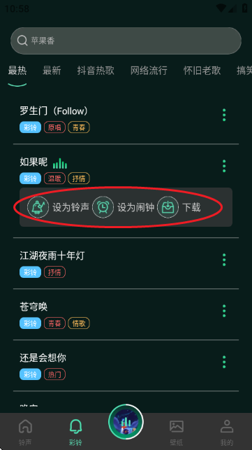 选择任意彩铃后,你可以将其设置为手机铃声、闹钟提示音,或直接下载到本地,适应多种使用需要。