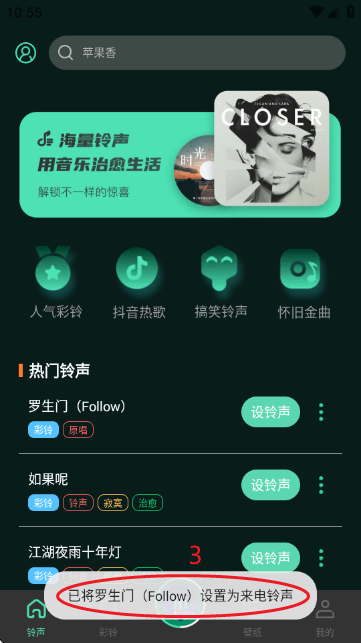 成功授权后,所选铃声便会自动设置为你的手机来电铃声。例如,你可以将“罗生门(Follow)”这首歌设定为专属来电提示音。