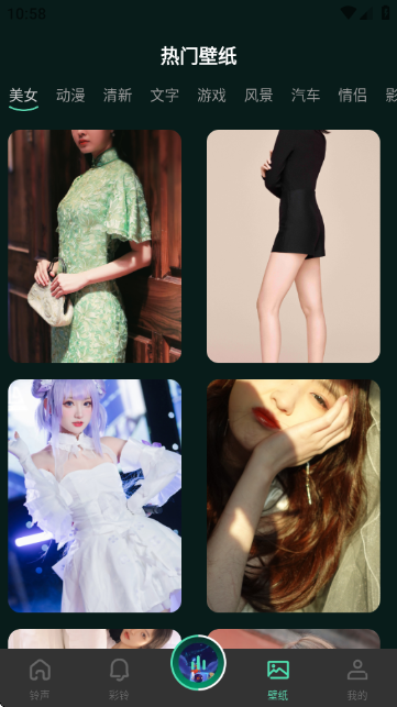切换到“壁纸”板块,可以按照美女、动漫、清新等主题分类查找壁纸,各种风格的热门图片都能找到。