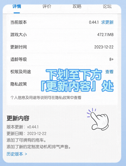 搜索游戏名称并进入详情页面,下滑至“更新内容”区域,即可进入“历史版本”页面下载。