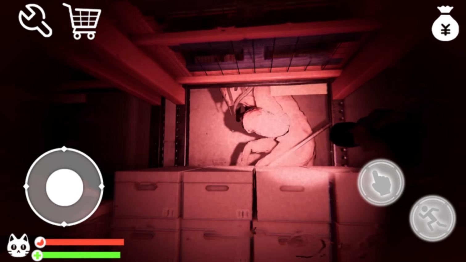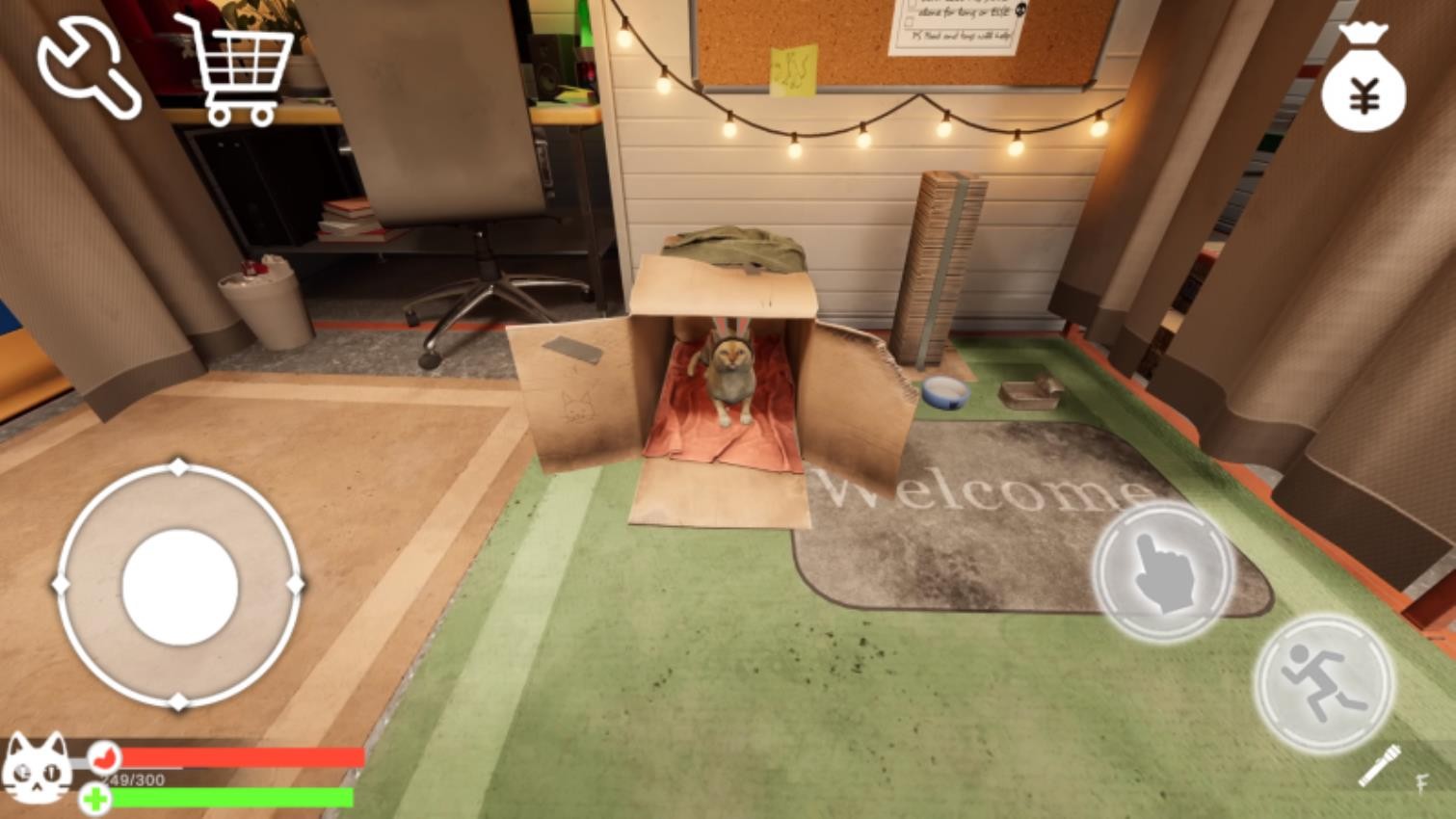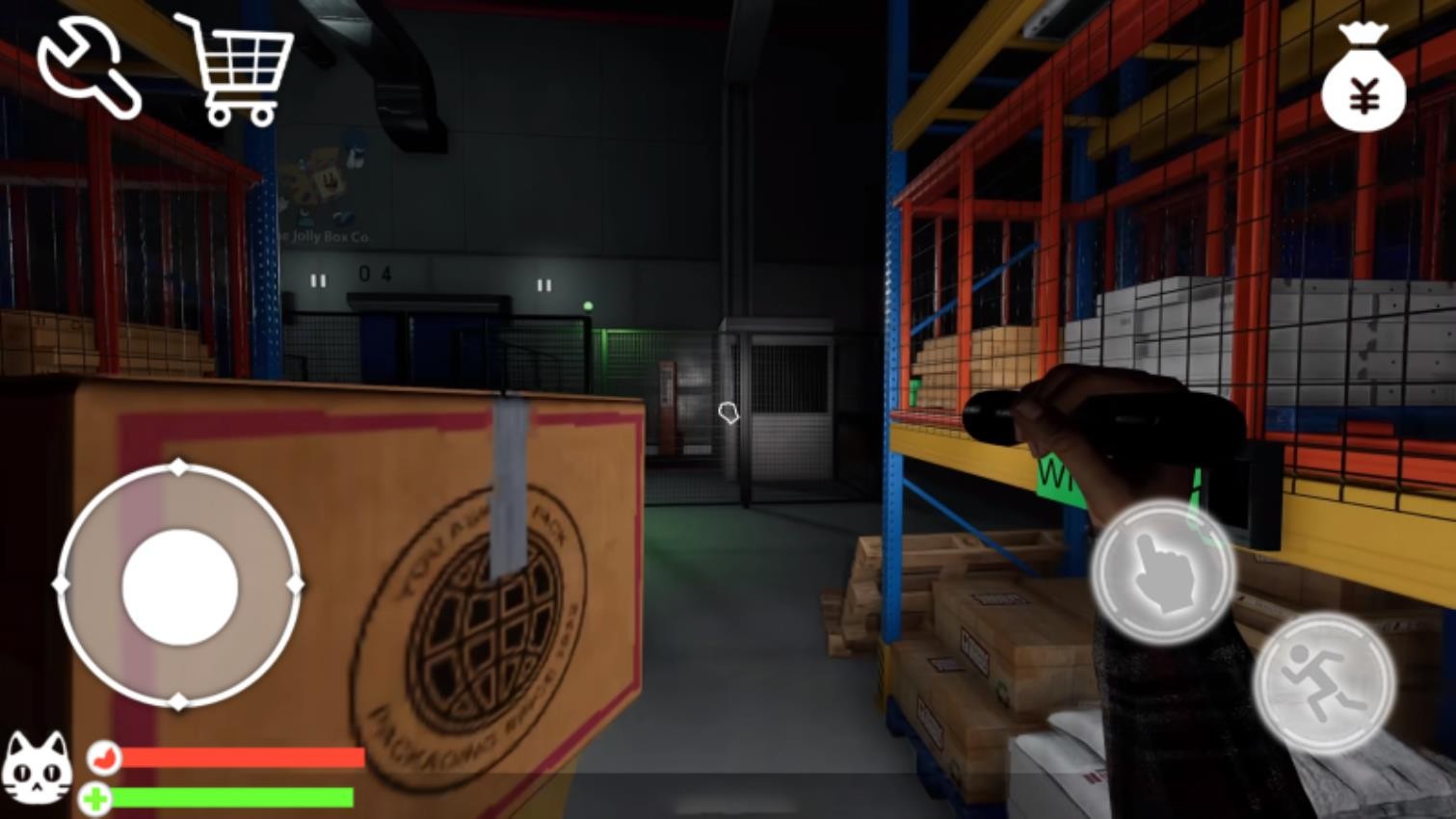 1、位于仓库场景时,使用左下方向键移动,点击右下互动按钮检查箱子与货架。注意左上角的扳手工具与购物车图标,它们可能用于修理或运送物品。同时留意左下角猫咪头像显示的生命值状况。