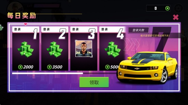1、每天登录都能领取奖励,连续七天签到还能获得一辆豪华汽车。