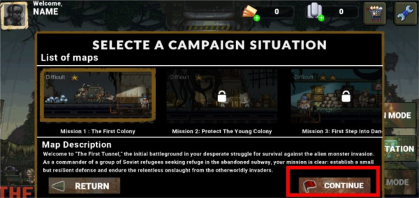 2、在地图选择界面中,点击继续按钮进入关卡。