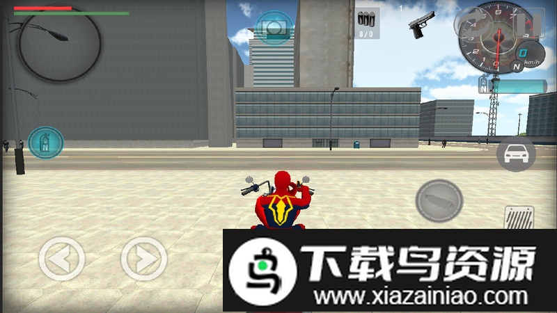 1、操作十分简便,通过左右移动按键或摇杆即可控制蜘蛛侠行动,点击蜘蛛网图标能发射蛛丝在城市中飞荡,使用射击按钮向敌人开火;