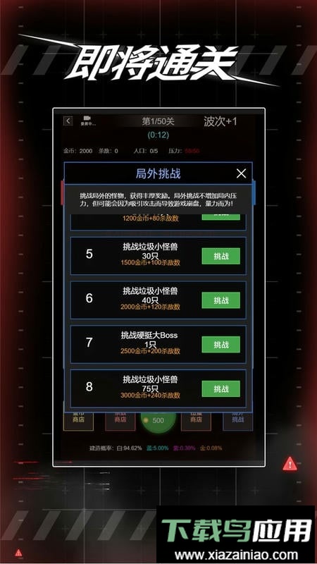 即将通关是一款融合随机布局与塔防竞技的手游,采用肉鸽式开局机制,确保每次进入游戏都面临截然不同的挑战。玩家需要规划基地建设、训练作战单位、提升技能等级,以应对持续升级的战斗浪潮。