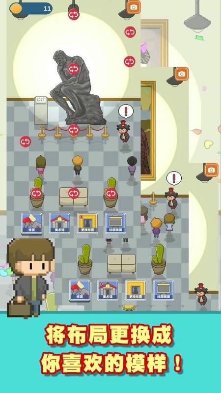 玩家需要仔细观察上下两幅美术品,点击其中的差异之处来完成修复;同时可使用双指缩放画面查看细节,或点击来访的客人收集金币,实现修复与经营同步进行。