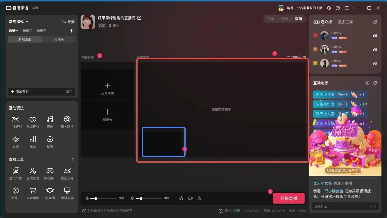 2、直播:支持灵活调整双机位的布局/比例/大小