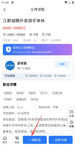 3、在工作详情页面点击一键投递按钮,完成该职位的简历投递操作。