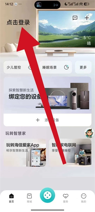 1、打开海信爱家,在首页左上角点击点击登录,进入登录选择页面。