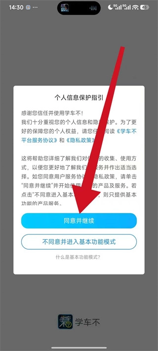 1、打开学车不,弹出弹窗后,点击同意并继续,进入主界面。