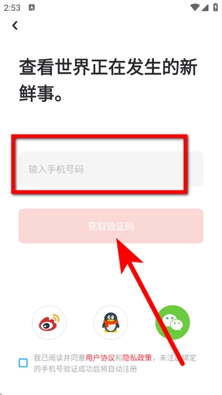 3、在登录界面,输入手机号码,点击获取验证码。