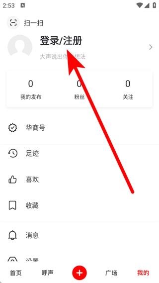 2、在我的页面,点击登录注册区域,进入登录界面。