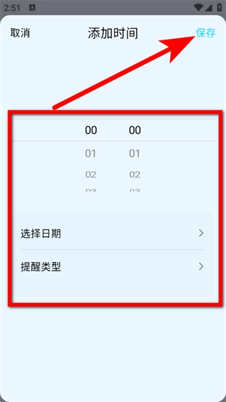 4、在添加时间页面,设置提醒的时间、日期、类型等信息,点击保存,完成提醒设置。
