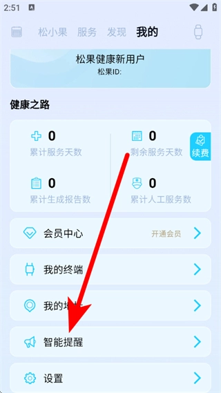 2、在我的页面,点击智能提醒,进入智能提醒页面。