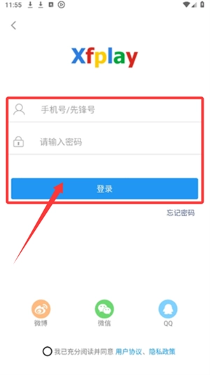 2、在指定位置输入手机号或先锋号,填写密码后点击底部登录按钮。