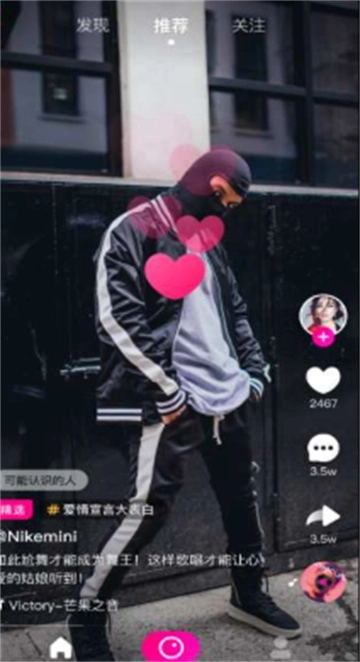 2、推荐界面支持上下滑动屏幕来浏览视频,点击爱心图标即可完成点赞操作。