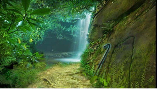 19、前往场景29,用锤子敲碎瀑布,进入场景34,根据记录图形解开墙壁谜题,开启场景37石门。